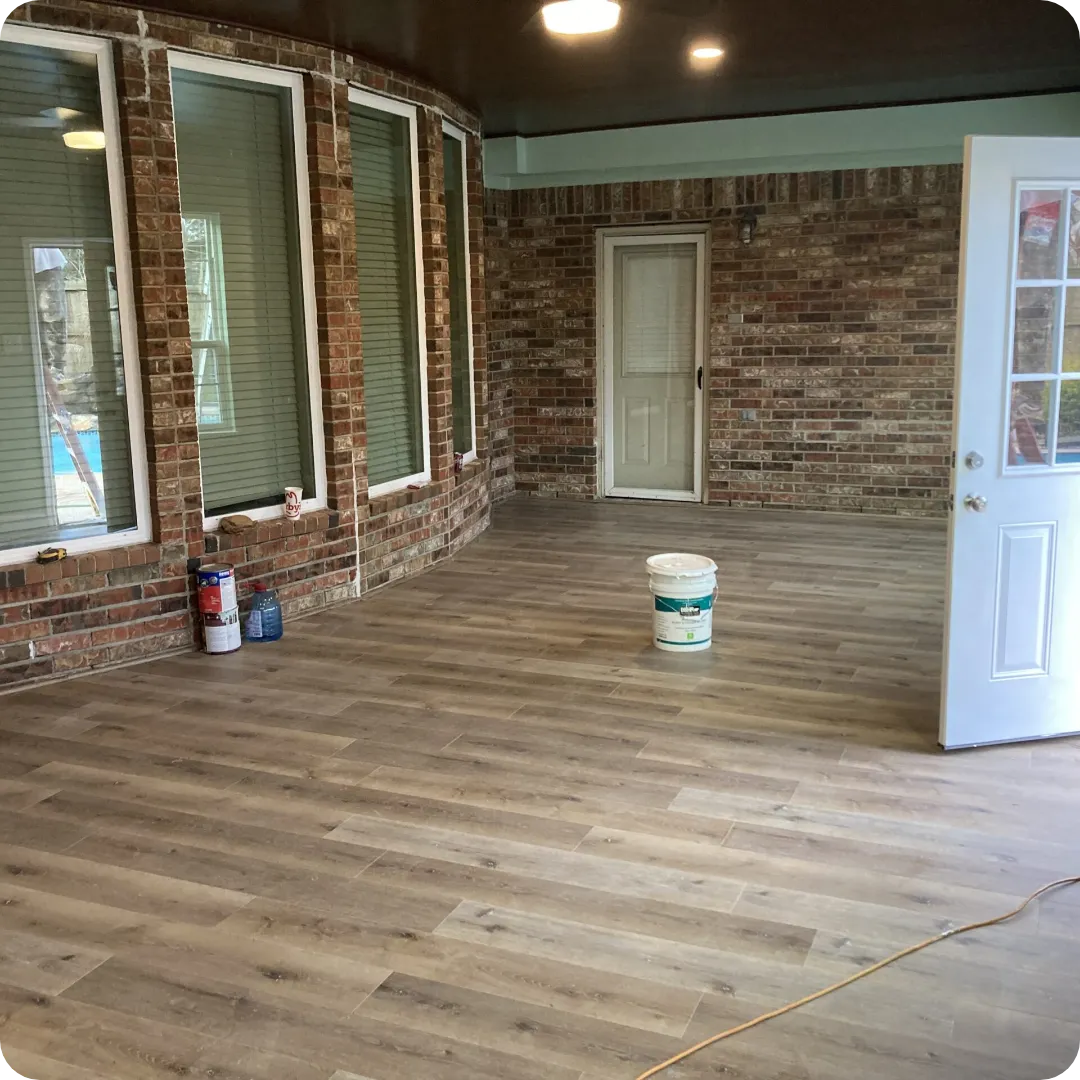 This project involved the professional installation of high-quality wood-look flooring in a covered patio / indoor outdoor living area. The objective was to enhance the space with a warm, modern finish while ensuring durability and weather resistance. Our team carefully prepared the surface, aligned each plank with precision, and delivered a seamless flooring layout that complements the brick exterior and architectural design. The result is a stylish, low-maintenance floor that elevates both comfort and property value.